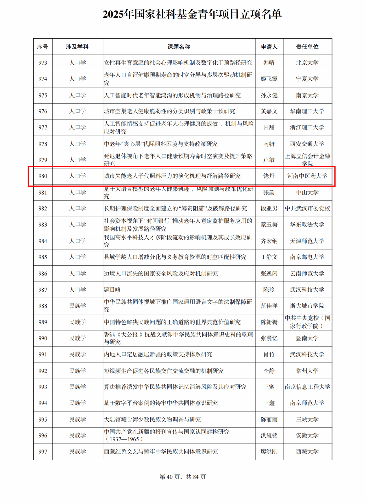 (文/图 张志昊)日前,国家社会科学基金项目2025年度立项名单正式公布,管理学院饶丹博士申报的青年项目“城市失能老人子代照料压力的演化机理与纾解路径研究”成功获得立项。此次立项标志着学院在国家级科研项目申报中持续保持良好态势,近五年来,学院已累计承担国家社科基金项目7项,为学院学科建设与高质量发展注入持续动力,有效激发了教师投身科研的积极性。