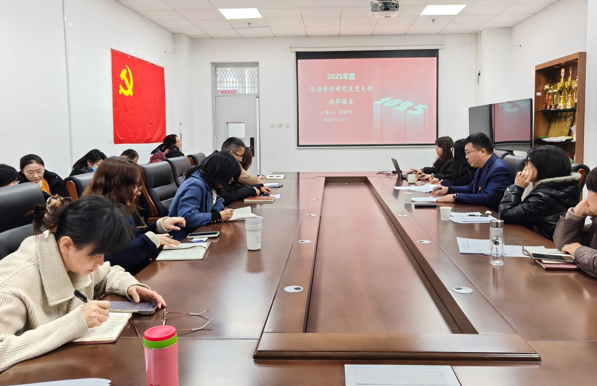 (文/图 彭坤)为全面检验2025年度各党支部党建工作成效,凝聚推动学院高质量发展的组织力量,2026年1月23日,管理学院在A542会议室隆重召开2025年度党支部书记抓党建述职会。全体教职工党员参会,会议由刘继刚院长主持。